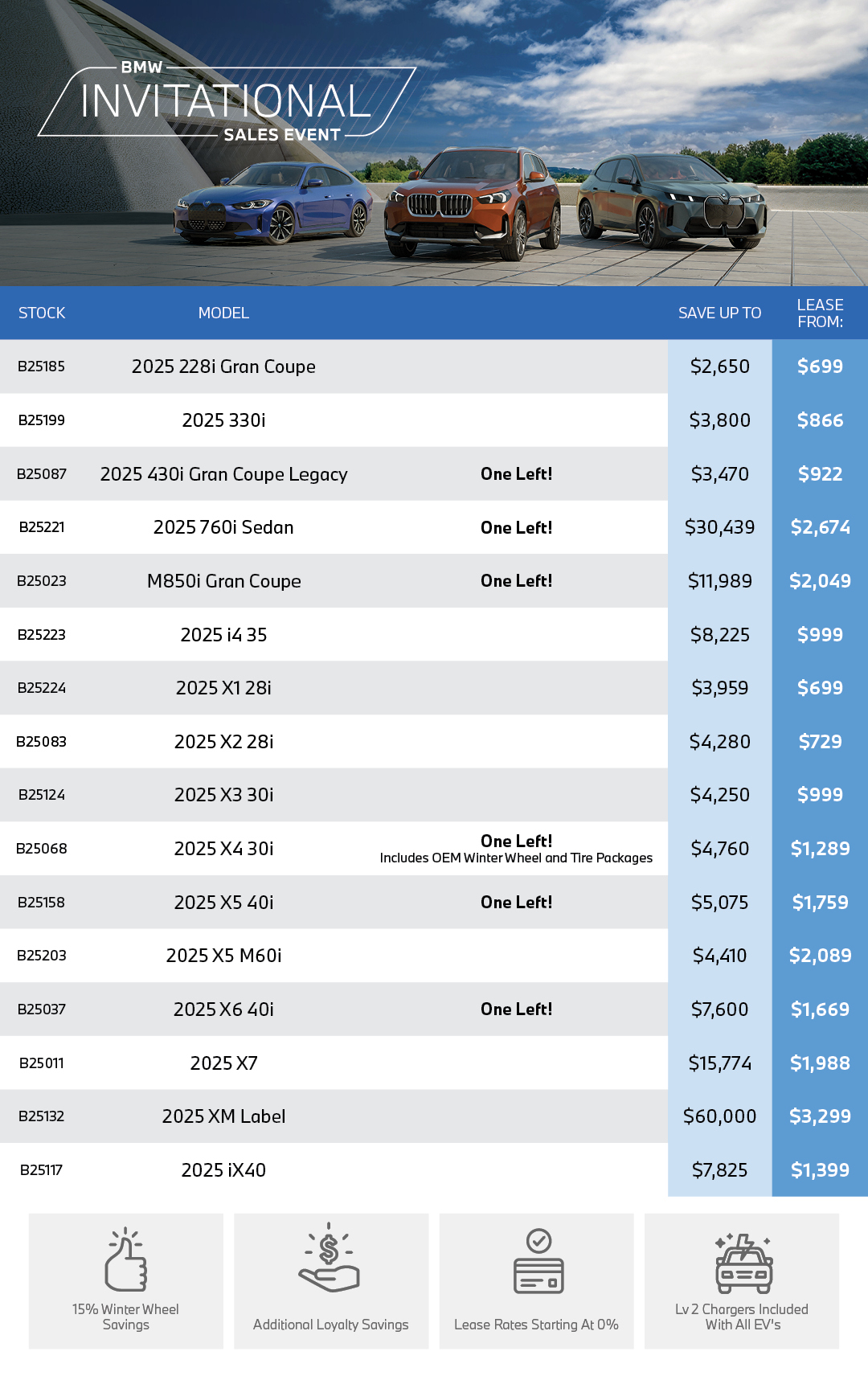 B25083: Customer Incentive: $3,364. Down Payment: $2,836. All prices and payments are plus PST and GST. $739 monthly lease payments based on a price of $56,099 and calculated at 3.99% APR over 48 months, OAC, with a total lease obligation of $38,468. 32,000 kilometer total allowance with excess kilometers charged up to $0.25 per kilometer. Offers valid until month-end unless otherwise extended. See BMW Winnipeg for full offer details. DLR#9740.